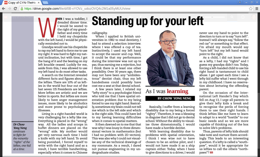Do you know that forcing a left-handed child to use her/his right hand is tantamount to child abuse? I wrote this article 3 years back when I was a columnist of the now defunct, The Heat. I hope to spread this message to help fellow lefties so that they do not have to suffer the irreparable damage like me. So by now many of my university mates should know why I did not take up engineering at Queen’s University of Belfast (though the admission officer, Mr. Sterling Weisner did offer me to read all engineering degree programmes in 1982, except for Electrical & Electronic Engineering)!